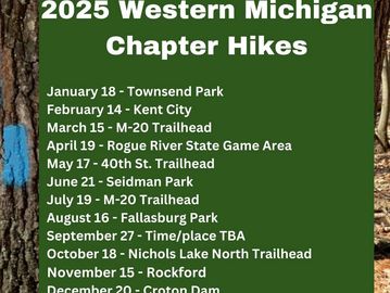 This graphic advertises dates and locations for the North Country Trail Association Western Michigan Chapter's monthly group hikes. More specific information (including time, starting point, and mileage) is shared closer to each hike.